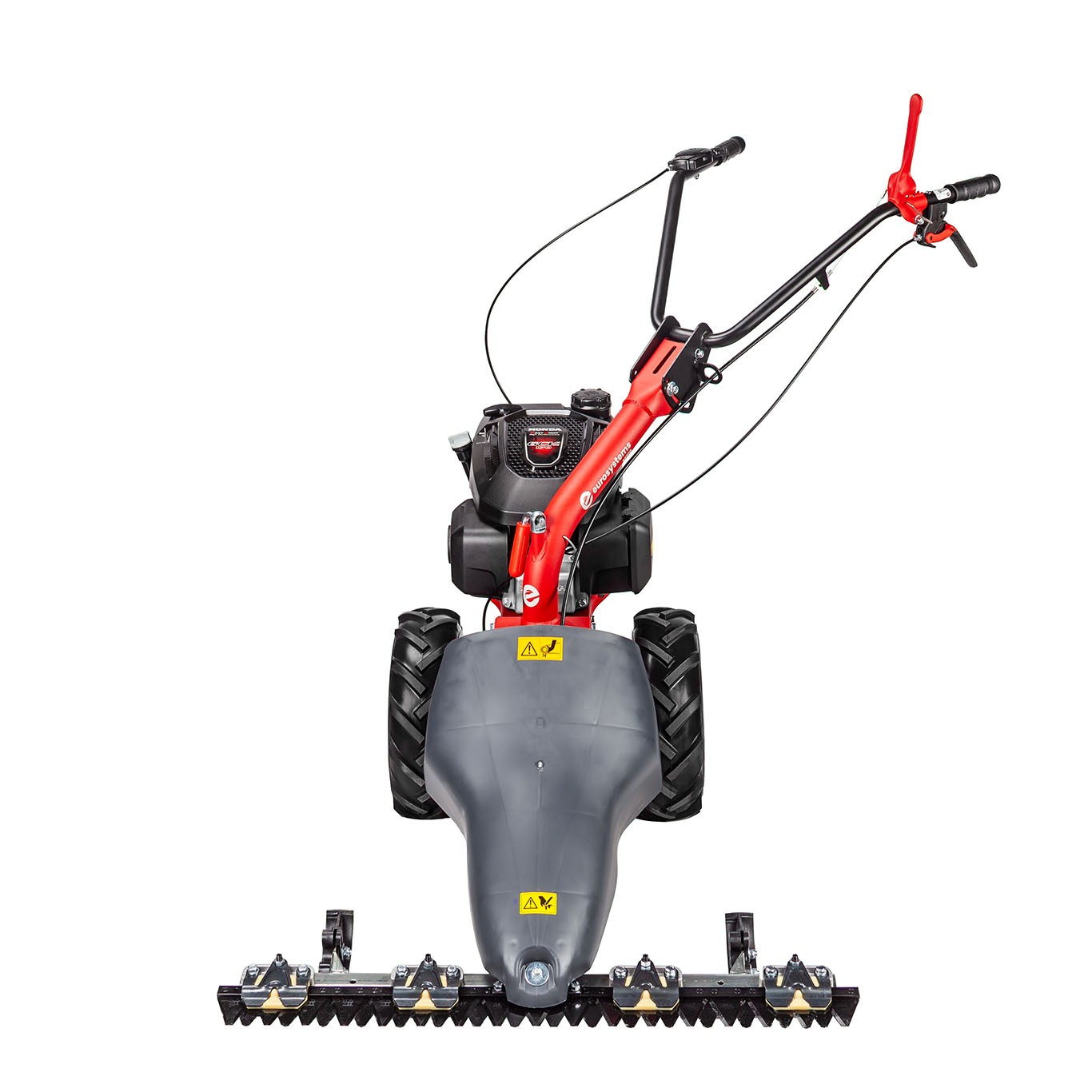 Eurosystems Doppelmesser Balkenmäher verfügt über einen einzigen Vorwärtsgang und Ackerräder, die von einem Schneckengewinde im Ölbad betriebenen werden. Das Zubehör Mähbalken 87 cm (serienmäßig geliefert und im Preis enthalten) mit Doppelmesserbewegung (der Mähbalken verfügt über ein Untermesser und ein Obermesser, die sich gegensätzlich bewegen).